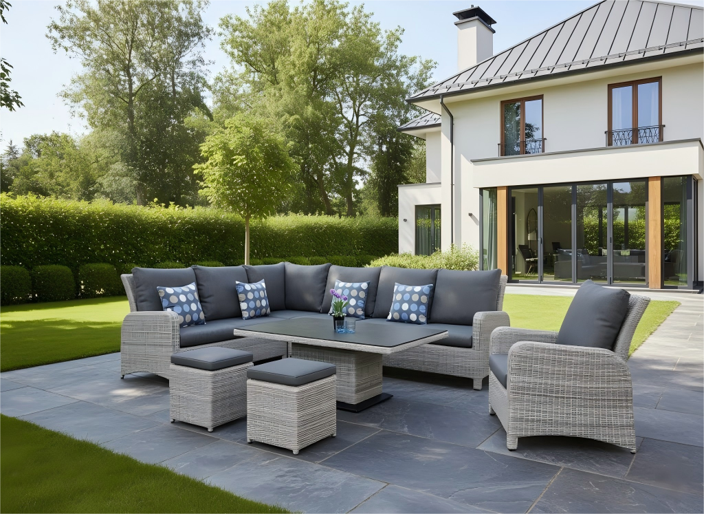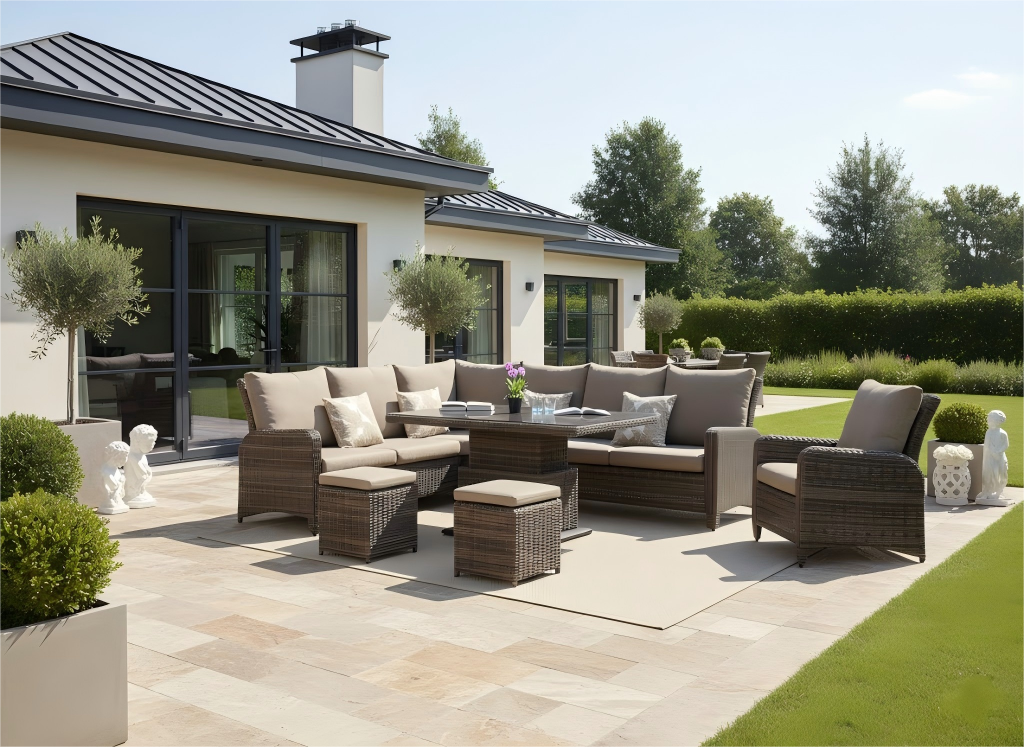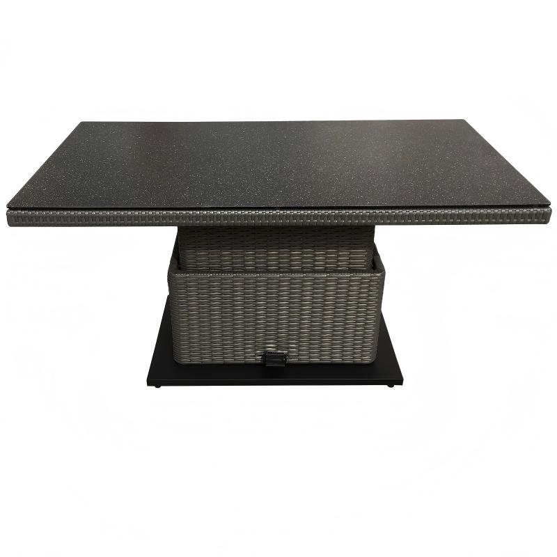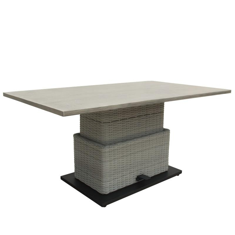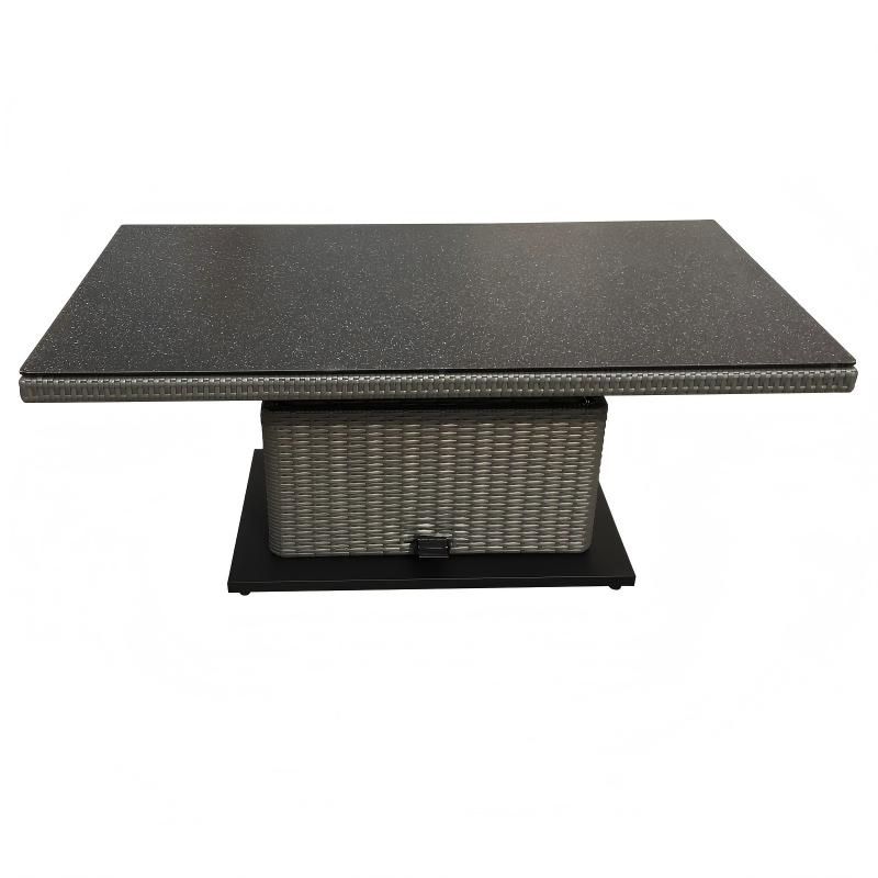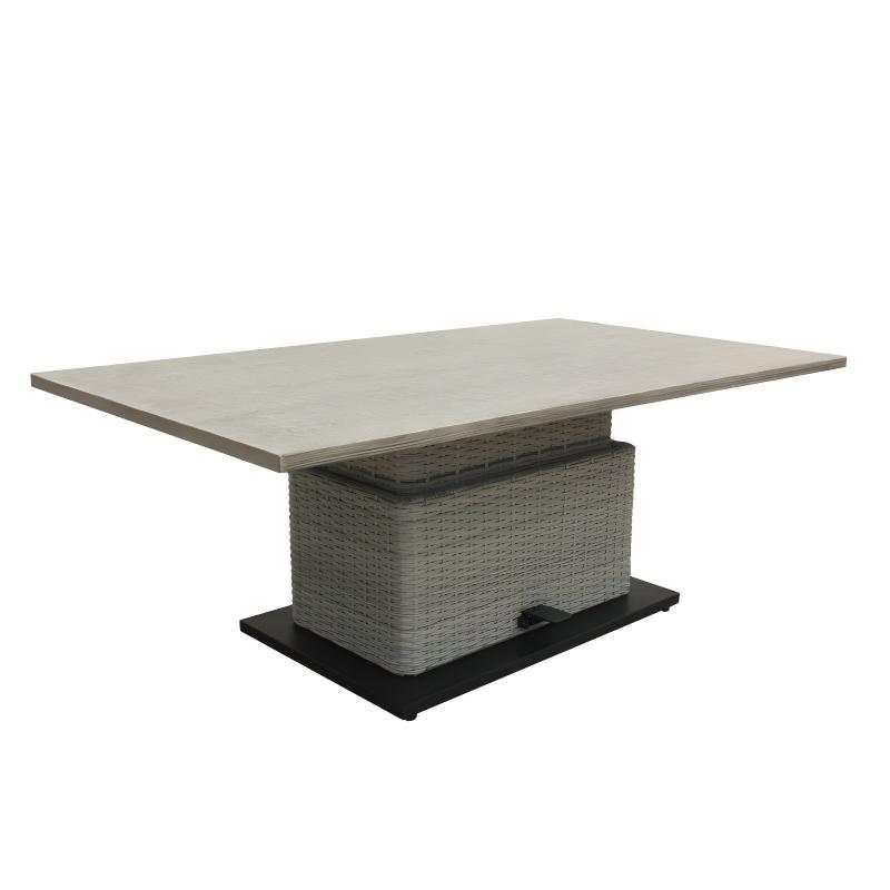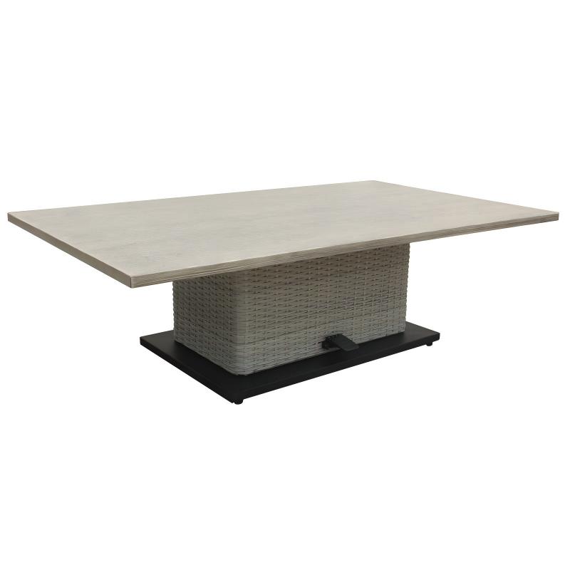 The desktop of Garden Adjustable Height Table is made of light beige rectangular flat tiles imitating wood grain. The material is durable and suitable for outdoor environments. The main body of the table is made of light grey imitation rattan woven structure with fine texture, which combines decoration and outdoor weather resistance. The bottom is a black stable base, and there is also a foot pedal component on the side, which is a device for adjusting the height of the desktop.The overall design is simple and fresh, and it is highly compatible with outdoor rattan sofas, lounge chairs and other furniture.