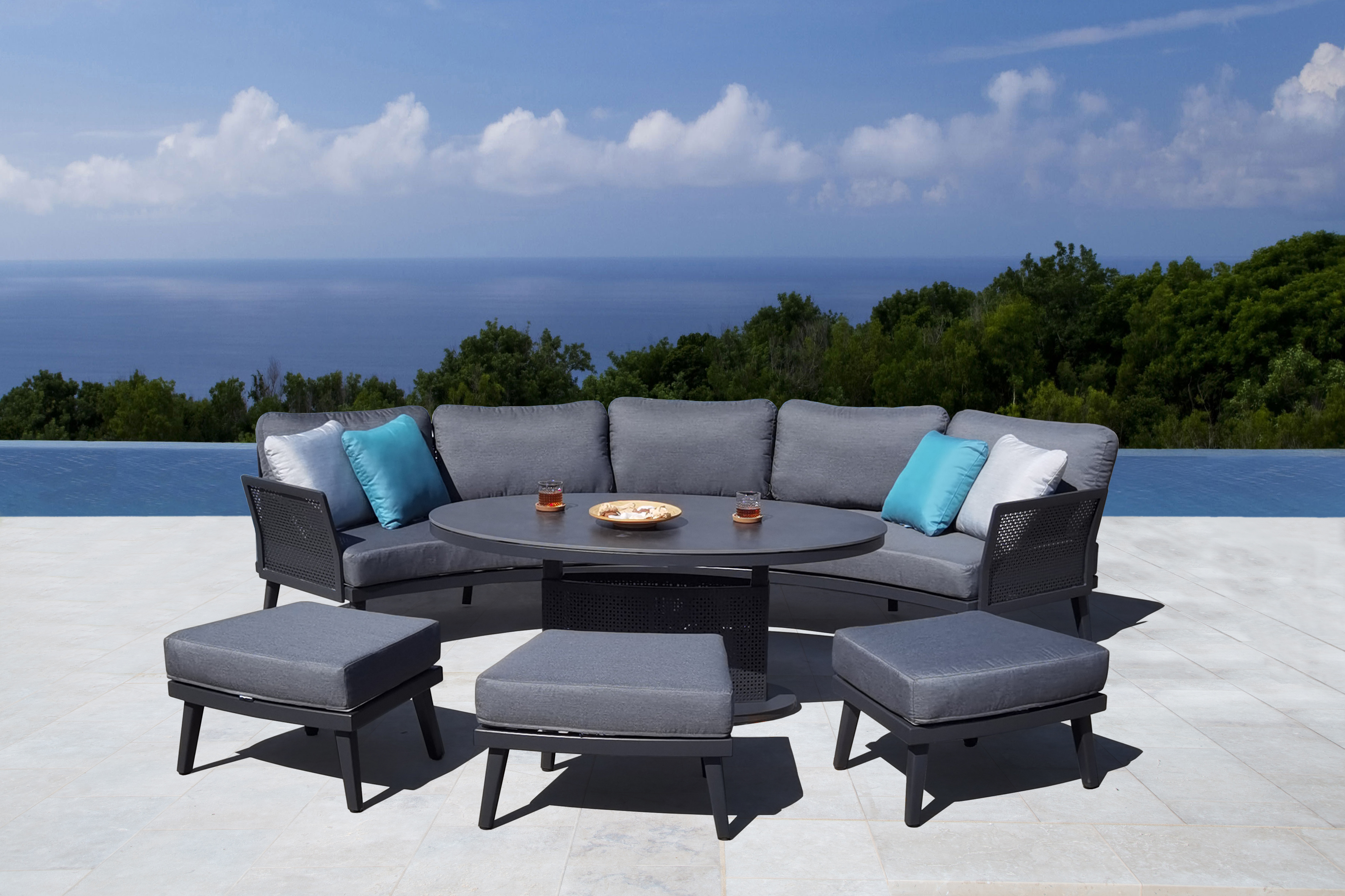 Alpha’s modular outdoor sofas look great with oval coffee tables and planters. You can mix and match what you like. These extras make your space feel ready for anything.