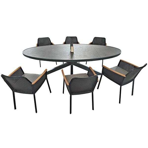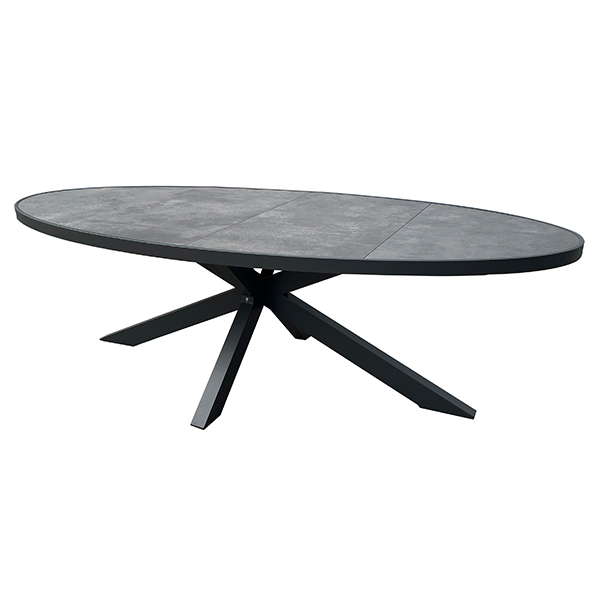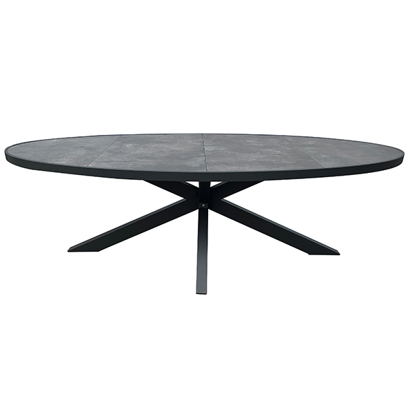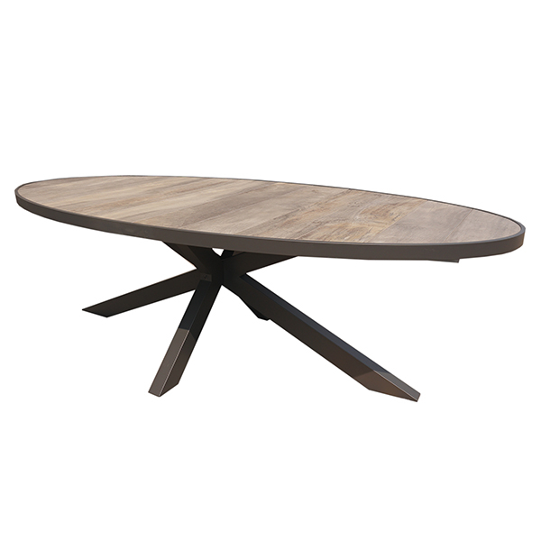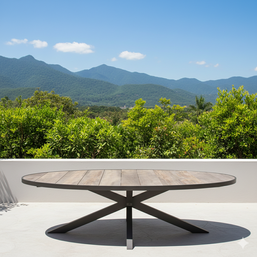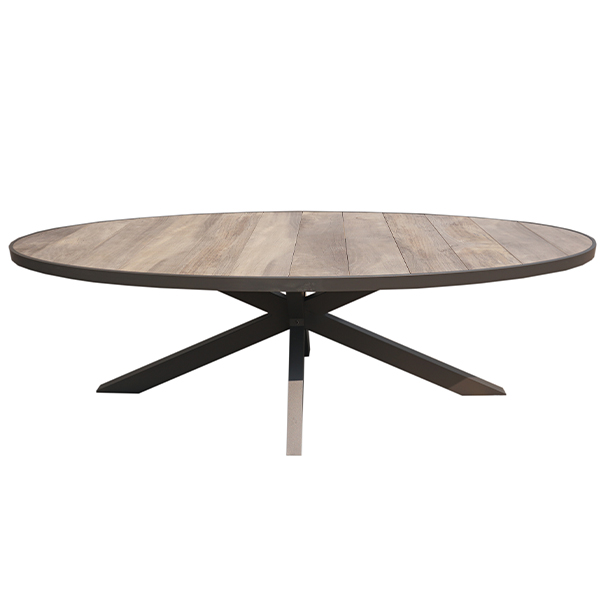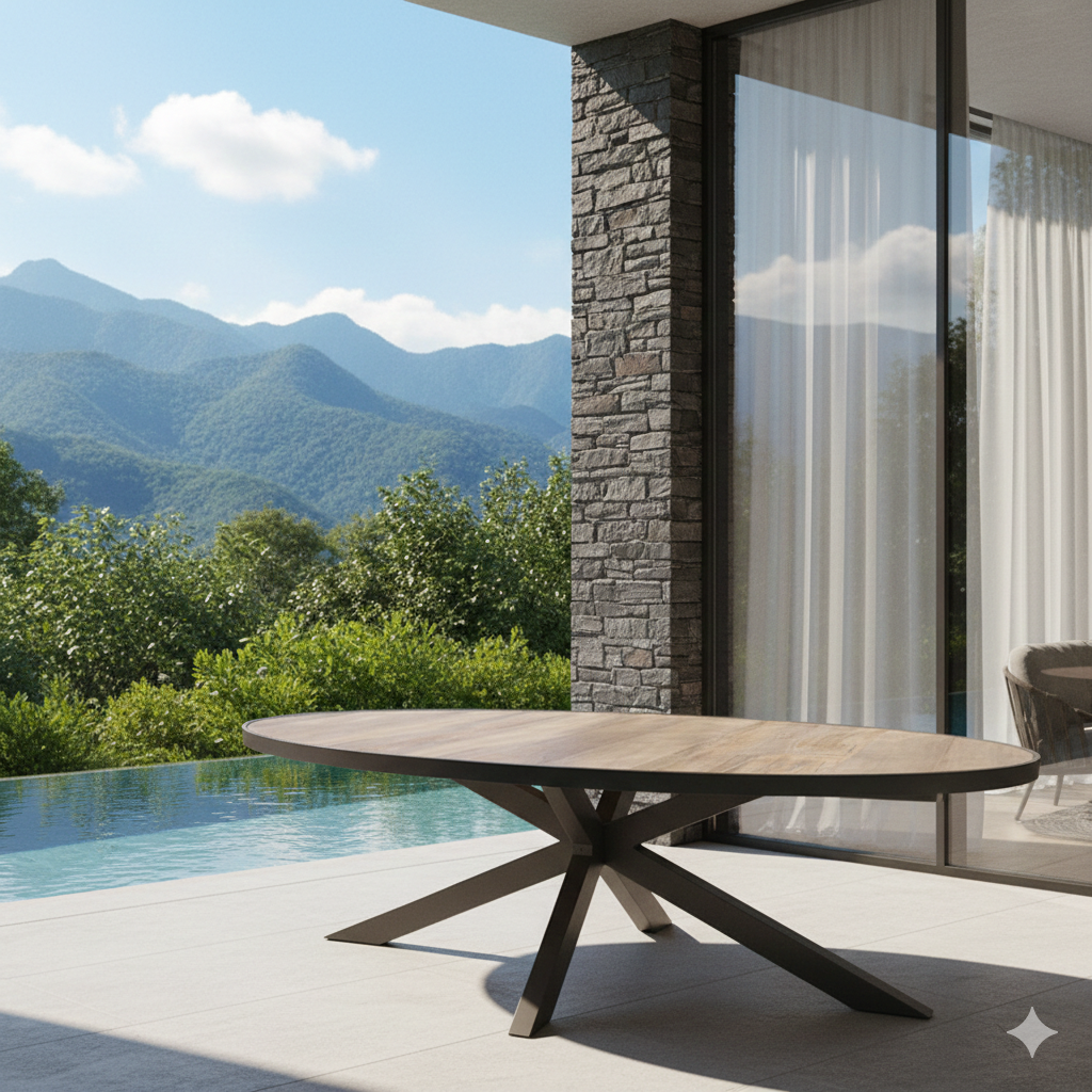 This oval dining table embodies the essence of modern European design, where minimalist aesthetics meet exceptional craftsmanship. Its expansive, gently curved top, finished in a warm, weathered wood-effect ceramic, evokes the organic grace of a jellyfish floating on water—sleek, fluid, and inherently elegant. The ceramic surface is not only visually striking but also highly practical, offering resistance to scratches, stains, and UV rays, making it ideal for both indoor and covered outdoor use. The table’s structure is a study in balance and strength. A robust, dark metal base features a striking starburst, X-shaped leg configuration that provides unwavering stability while creating a bold, sculptural silhouette. This industrial-inspired contrast between the soft, natural-looking top and the sharp, geometric base is a hallmark of contemporary European furniture design, creating a dynamic visual tension. Available in both oval and round configurations, this piece is designed to be the centerpiece of any dining space. Its generous proportions encourage convivial gatherings, while its sophisticated palette of muted tones—light wood, deep charcoal, and warm bronze—ensures it seamlessly integrates with a wide range of interior styles, from Scandinavian minimalism to industrial chic.