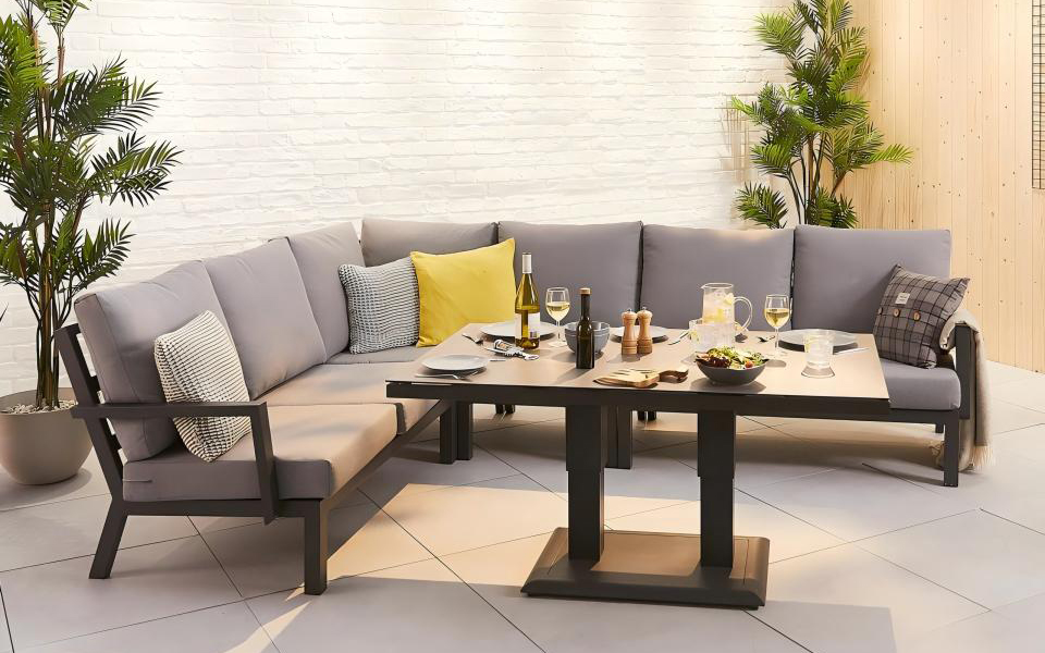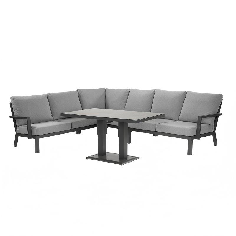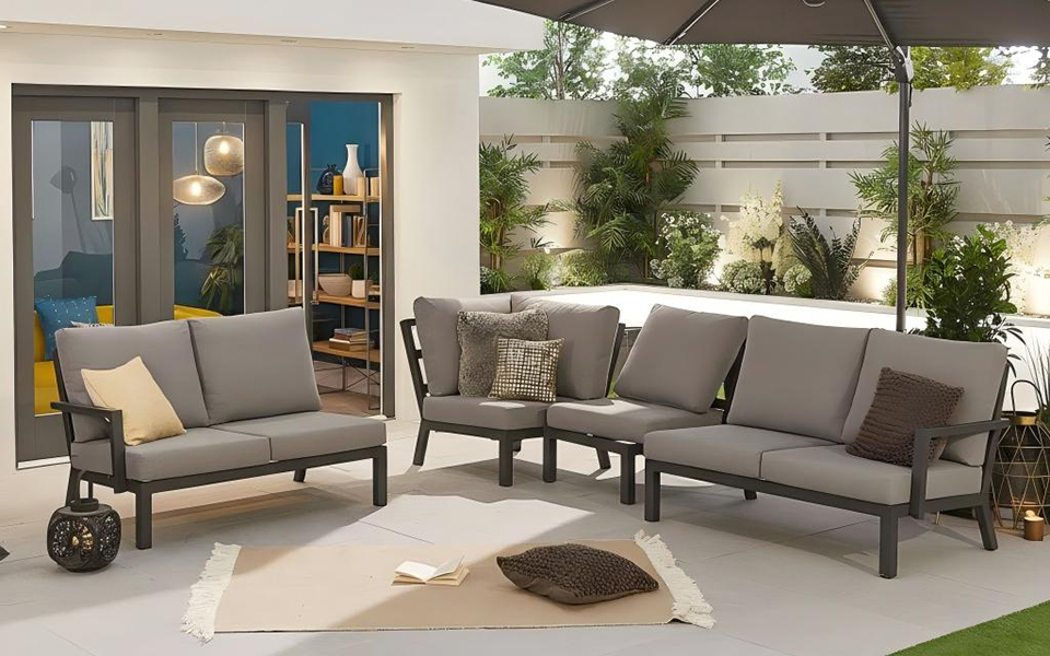Oran Modular Sofa Set is a modular combination system based on L-shaped planar topology, supporting reversible configuration on both the left and right banks. It integrates linear sofa modules and right-angle corner units to form a continuous rest interface. The deep gunmetal frame and the medium grey soft package form a low-brightness contrast, interpreting the material authenticity and functional aesthetics of contemporary outdoor Spaces.