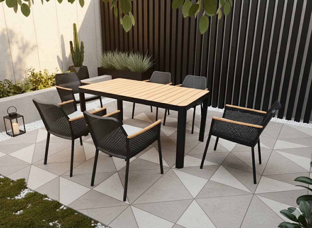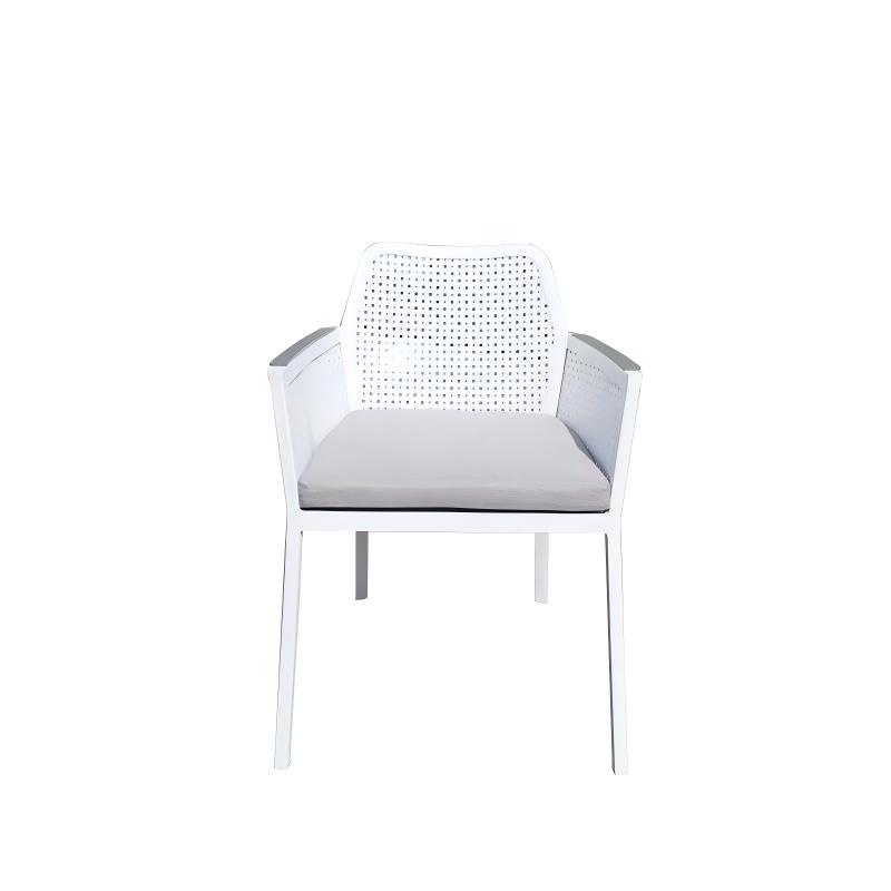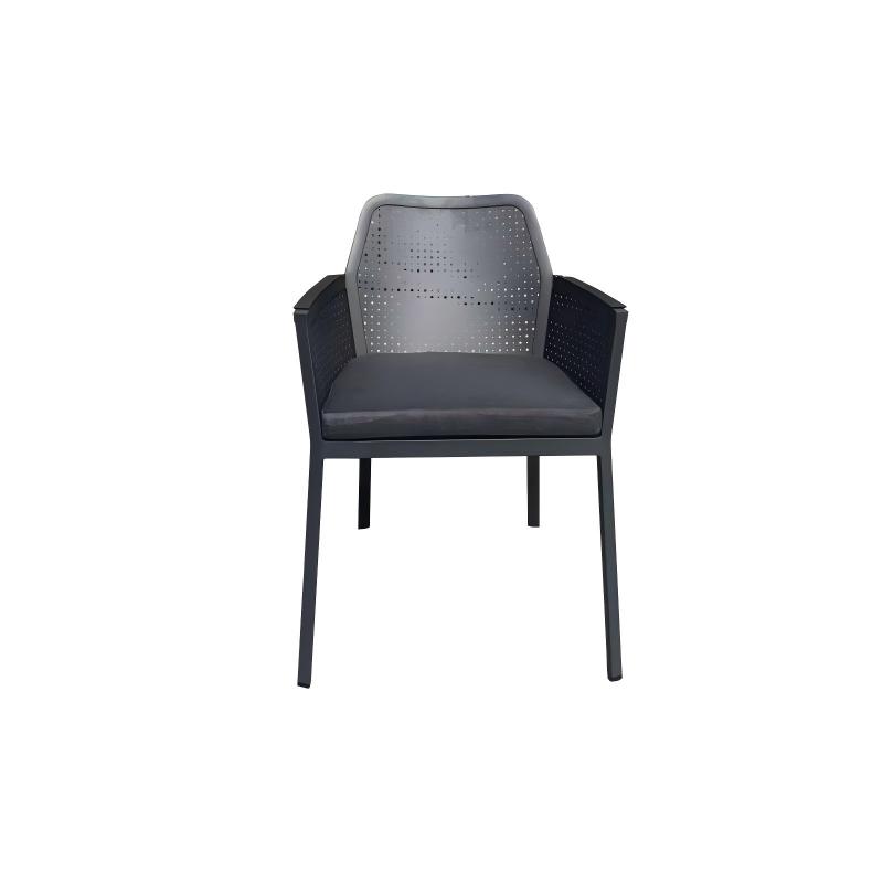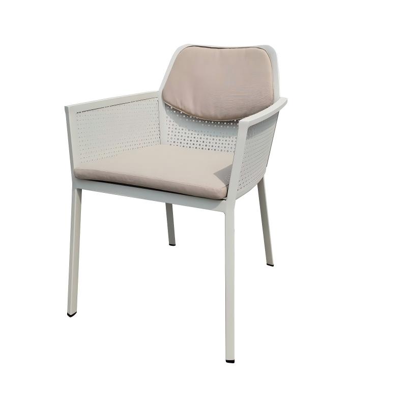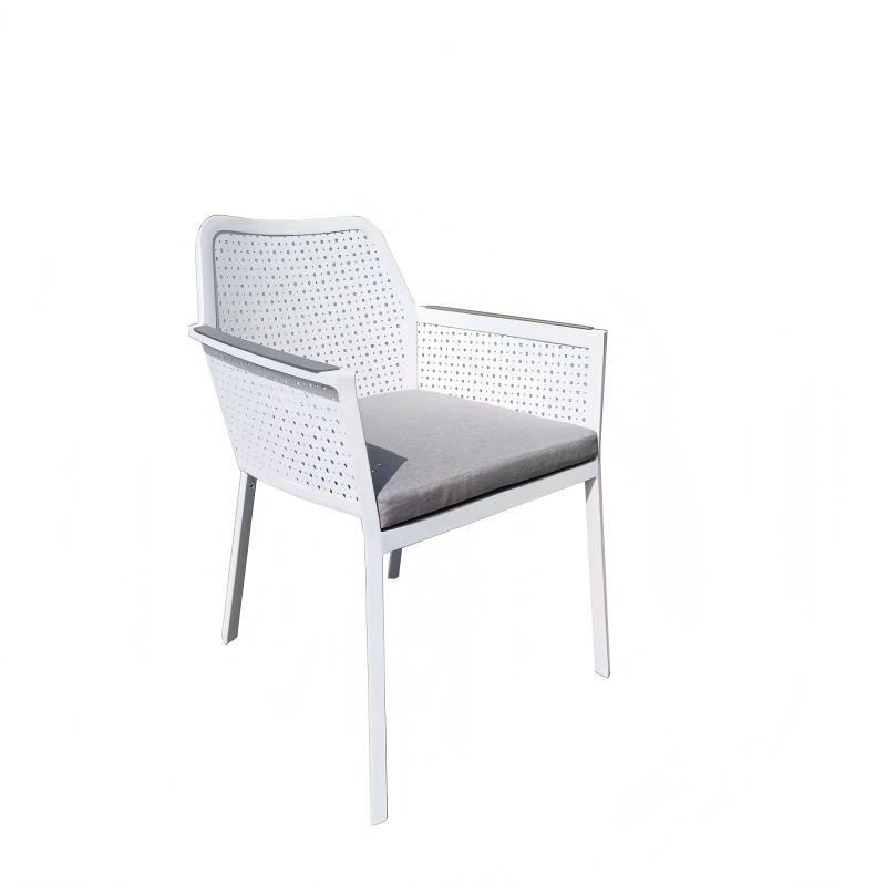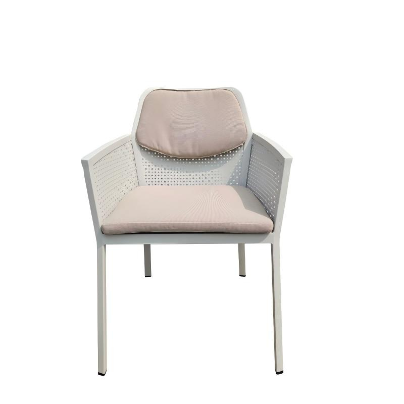 The Paris Dining Chair features a modern and clean design. It has a minimalist metal frame completed in black, beige or white matte finish. The backrest and side panels are made of a perforated aluminum plate with a consistent pattern of small circular holes, offering both breathability and a modern feel. The handrails come in a variety of combinations and can be made of teak, plastic wood, or even the original aluminum block handrails. The entire chair is like a "child opening its arms to you". Sitting on it gives you a wrapped feeling of being embraced. There is a thin rectangular seat cushion, and it can also be paired with a matching soft round cushion attached to the upper part of the backrest to increase comfort.