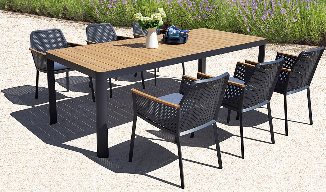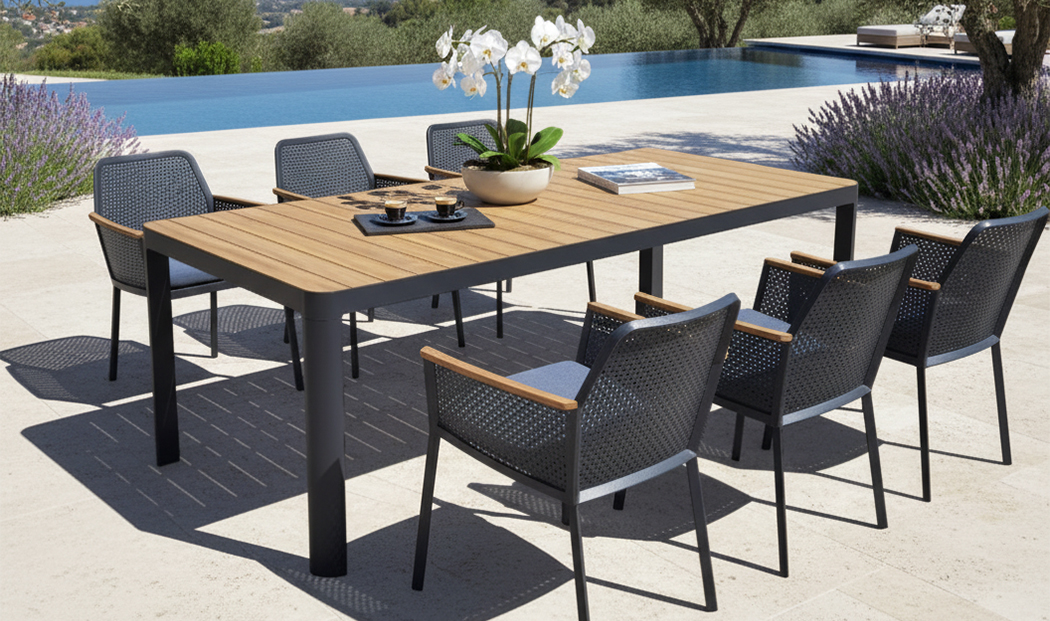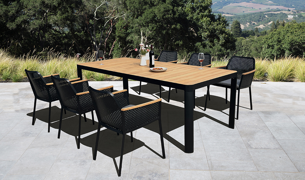 Paris Dining Table showcases the warm, natural hues of sustainably sourced teak, complemented by a high-strength aluminum frame for lasting durability.Its scientifically engineered table height and leg design create ample legroom, ensuring comfortable dining for hours. Hollow Design Dining Chair has an aluminum frame with extensive hollow designs, which are both aesthetically pleasing and help reduce weight. The scientifically designed seat depth and height ensure perfect comfort. Teak armrests add natural beauty and a warm touch, further enhancing the chair's comfort.