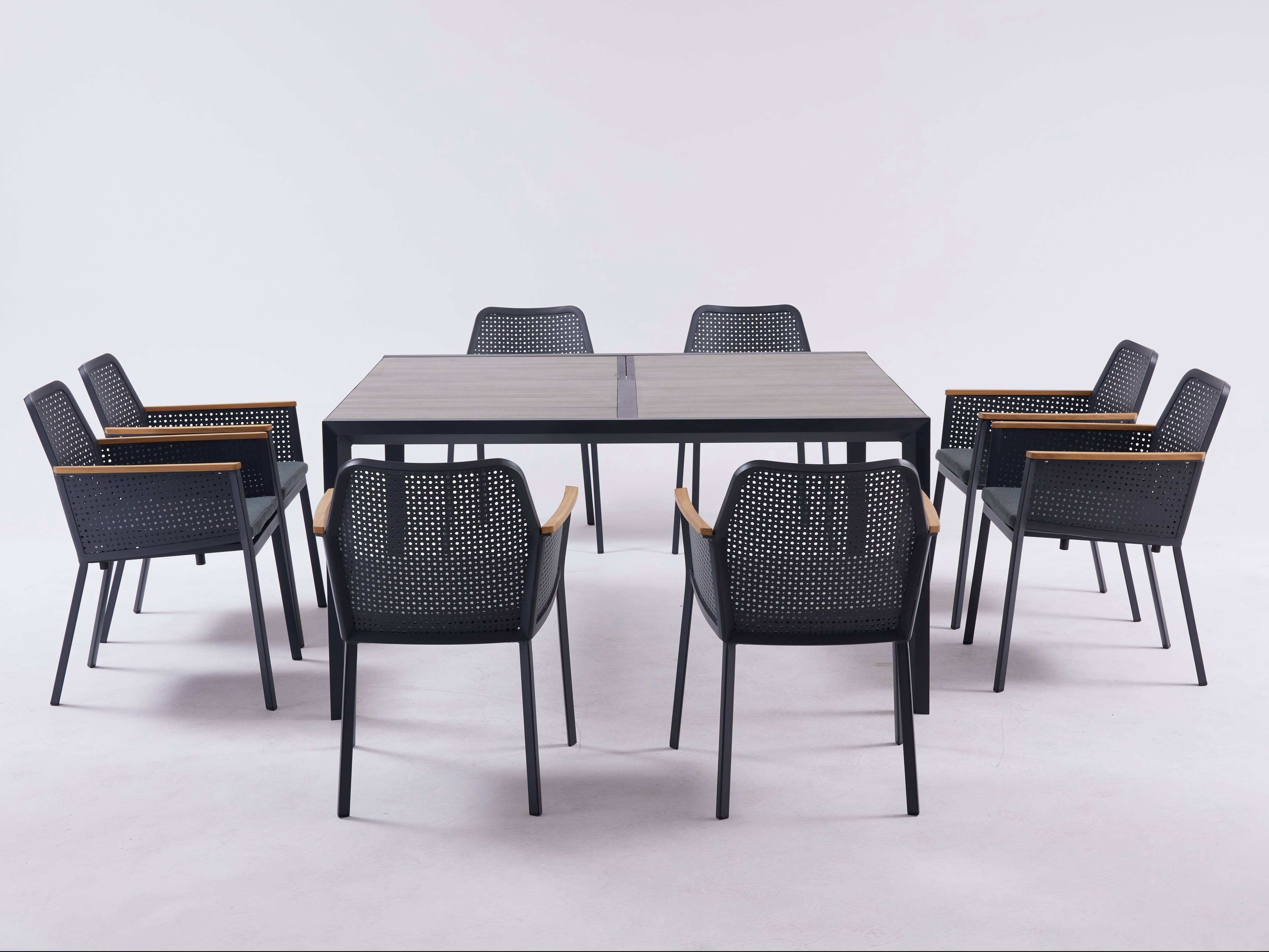 Aluminum alloy is especially popular in minimalist dining sets and lounge groups. Thin, squared-off legs, low armrests, and open bases create a visually light footprint that works on both large patios and compact balconies. Designers use aluminum to frame out: