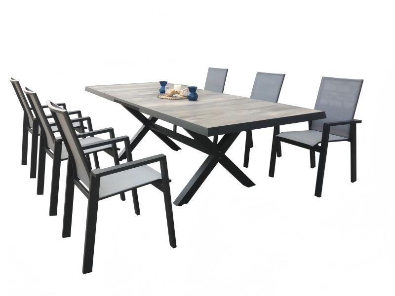 Aluminum frames with faux-wood or teak-look arm caps and tabletops.