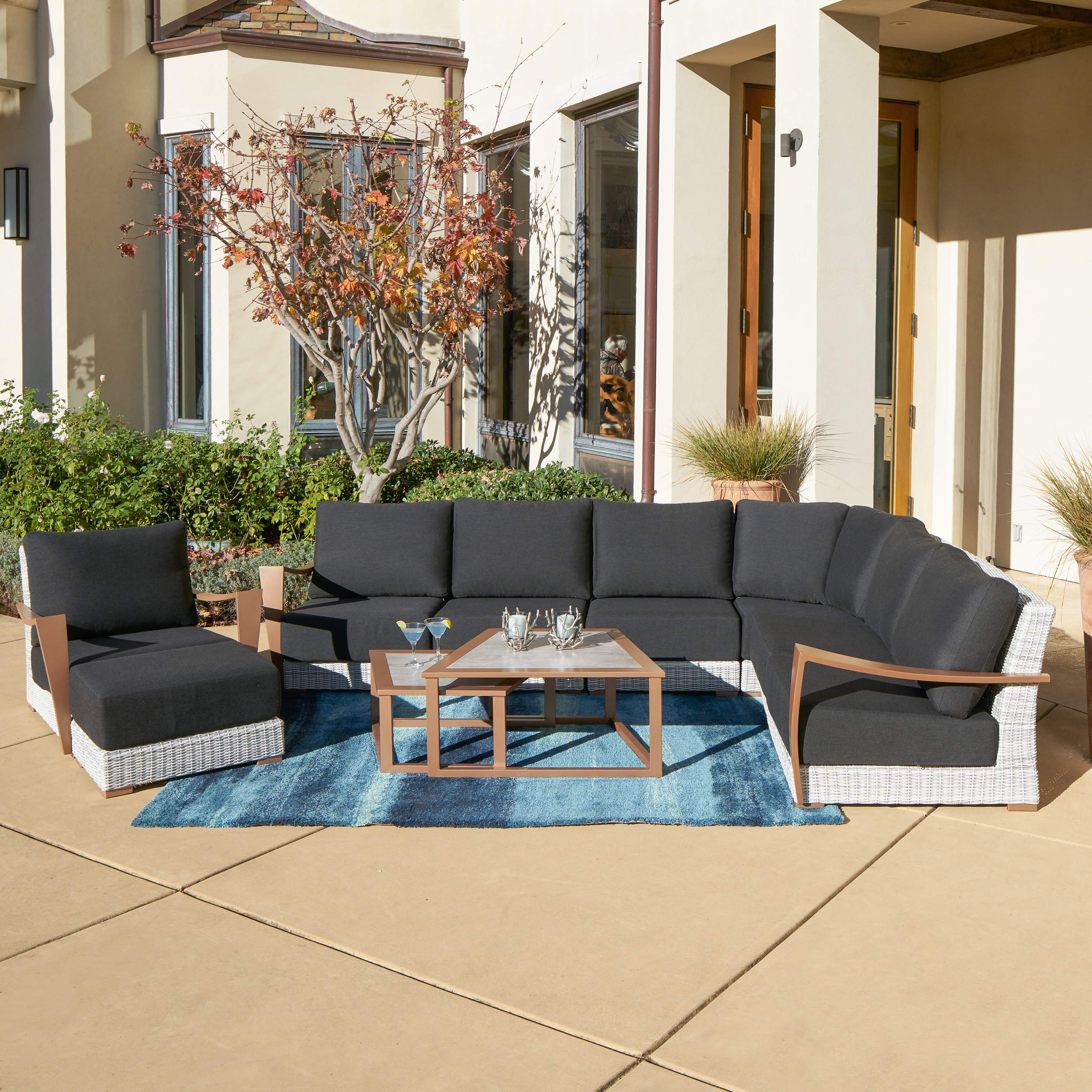 Sectional sofas and corner modules for outdoor living rooms.